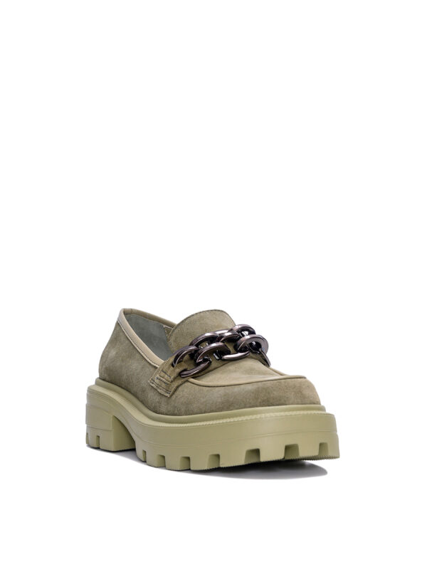 Если надоедают кофейные и молочные оттенки обуви, а классические черные или коричневые туфли тоже не хочется снова приобрести, присмотритесь к этой оливке! Интересный холодноватый цвет туфель контрастирует с уютной теплотой материала исполнения – высококачественной итальянской замшей, а контрасты – это как раз то, из чего состоит современная мода. Интересный блеск обладают и аксессуарами, которыми украшены туфли – модные цепи сверкают очень стильно. Подошва пара монохромная, это будет выделять вас из толпы, потому что такое решение не слишком распространено, а в совершенстве выполнено ALEX BELL, подчеркнет авторский узнаваемый стиль самой обуви и ее обладательницы.