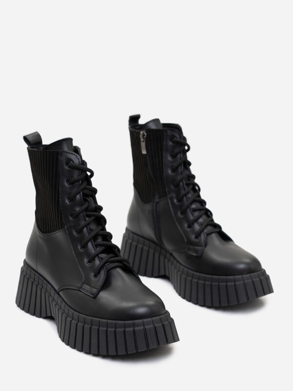 Высокие ботинки с вставками. Кожаные ботинки высокой посадки с байкой внутри. Модель на грубой подошве с декоративной верхней вставкой. Модель на молнии оснащена высокой шнуровкой.