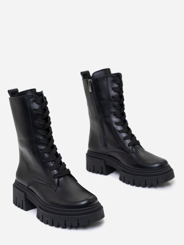 Высокие ботинки на байке со шнуровкой. Высокие ботинки на грубой подошве и низком устойчивом каблуке, выполненные из натуральной кожи на байке. Модель с боковыми молниями и шнуровками.