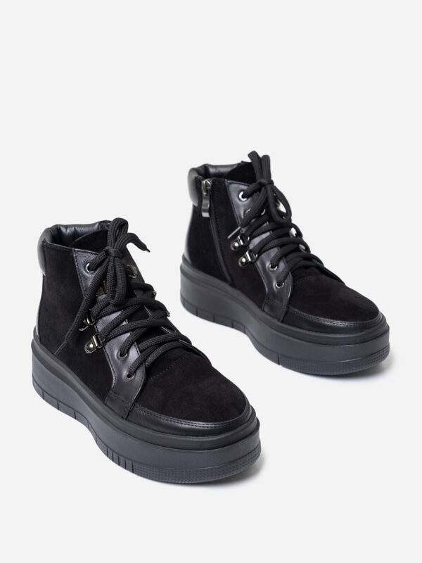 Высокие теплые ботинки из кожи и замши. Черные комбинированные ботинки из кожи и замши на меху. Модель на высокой подошве с боковыми молниями и шнуровками. Материал верха: нат. кожа/ нат.замша