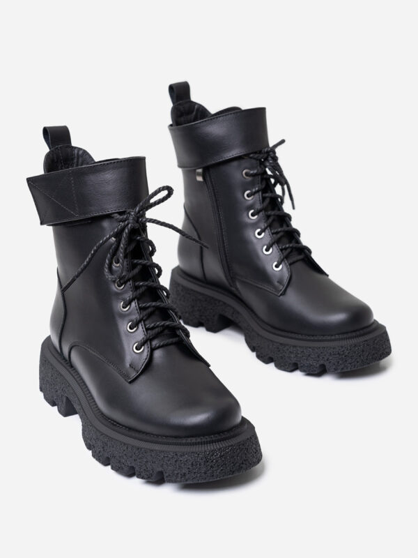 Высокие теплые ботинки с ремешками. Высокие зимние ботинки из натуральной черной кожи на меху со съемными верхними ремешками. Модель на высокой подошве с молниями и шнуровками.