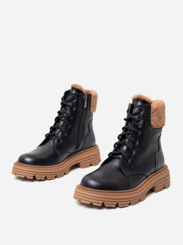 Черные ботинки на меху с коричневыми вставками. Черно-коричневые зимние ботинки из натуральной кожи на меху. Модель со шнуровками, вставками и боковыми молниями. Материал верха: нат. кожа