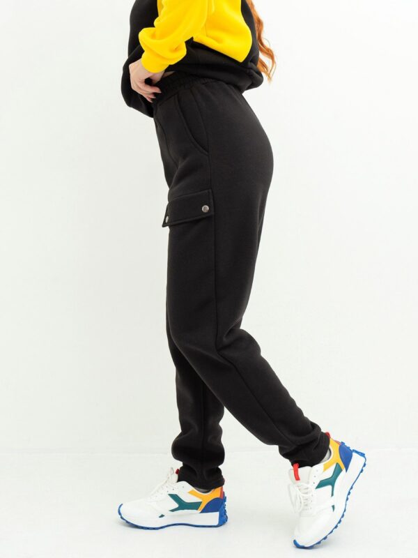 Утеплені чорні штани виконані з трикотажу на флісі з декоративним клапаном і заклепками. Модель з кишенями і прямим кроєм оснащена еластичним поясом і має високу посадку. Склад тканини: 50% бавовна, 50% поліестер. Матеріал: Трикотаж на флісі Напівобхват: Талія: S (32-42), M (34-44), L (36-46), XL (38-48), Стегна: S (52), M (54), L (56), XL (58), Довжина виробу – 102, Довжина за внутрішнім швом – 70, Тканина: Середньої еластичності