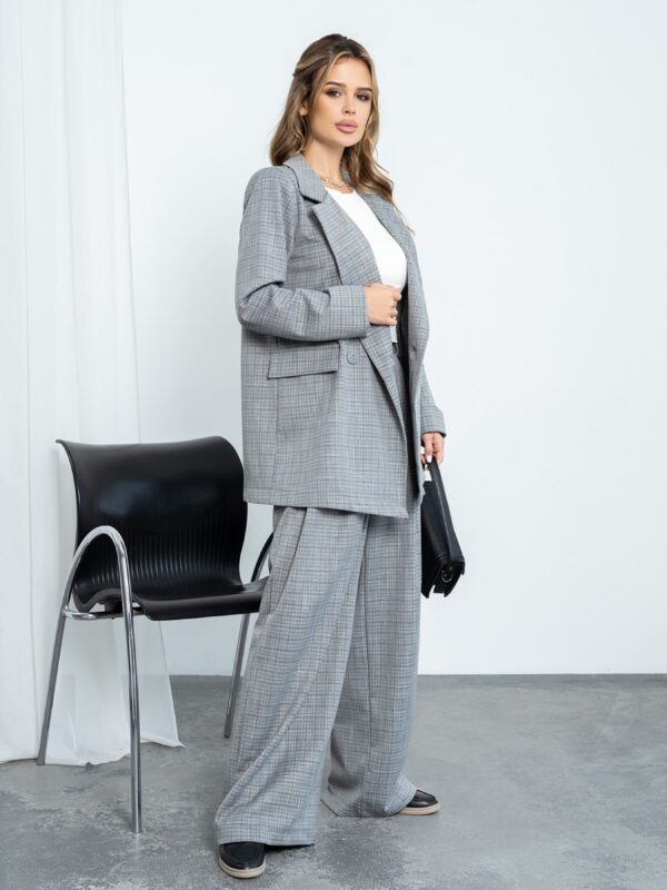Клетчатый свободный костюм серого цвета. Состав: 59% полиэстер, 21% эластан, 20% хлопок. Материал: Костюмка. Полуобхват: Пиджак: Грудь: S (50), M (52), L (54), XL (56), Длина изделия – 72, Рукав – 62, Брюки: Талия: S (31), M (33), L (35), XL (37), Бедра: S (56), M (58), L (60), XL (62), Длина изделия – 102, Длина по внутреннему шву – 74, Ткань: Низкой эластичности.