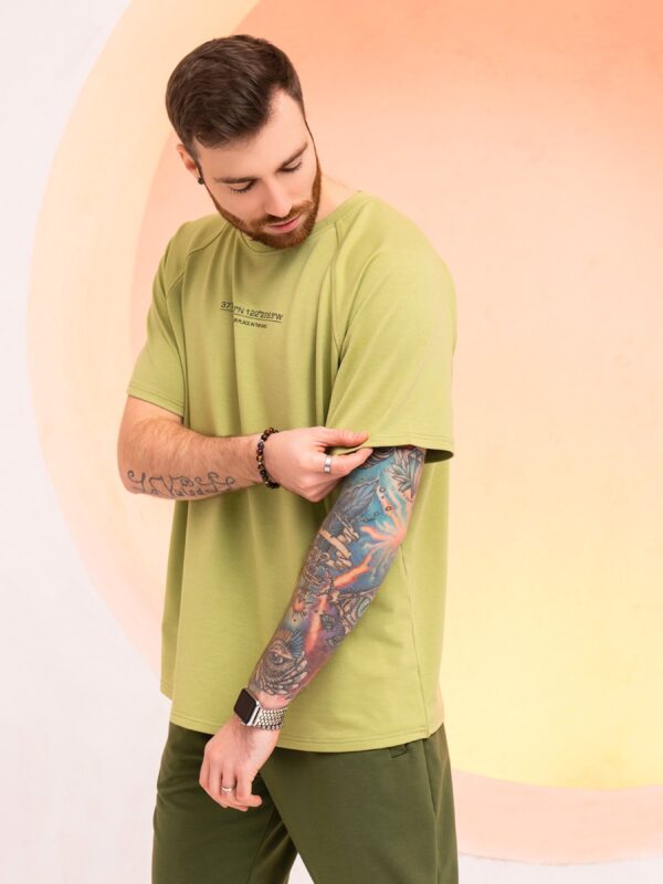 Оливковая удлиненная футболка прямого свободного кроя декорированная принтом. Изделие выполнено из двухнитного однотонного трикотажа с О-образной горловиной. Футболка оснащена свободными рукавами-реглан до локтей. Состав: 50% хлопок, 50% полиэстер. Материал: Двухнить Полуобхват: Грудь: S (59), M (61), L (63), XL (65), Длина изделия – 76, Рукав – 17, Ткань: Средней эластичности.