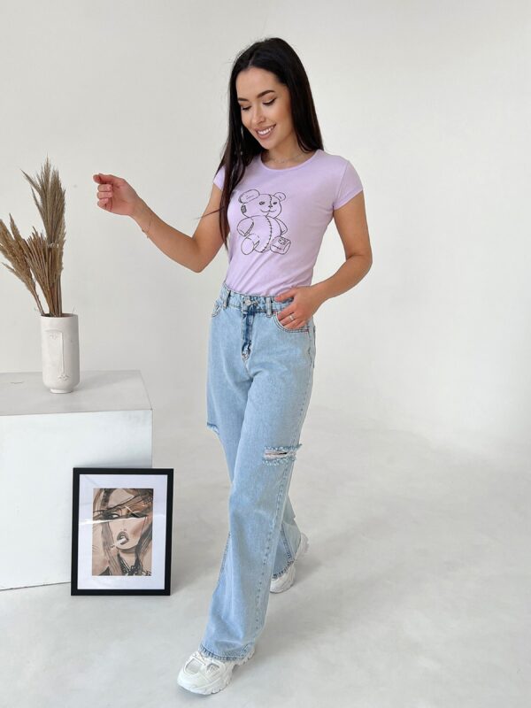 Сиреневая хлопковая футболка с мишкой. Состав: 100% хлопок. Материал: Коттон. Полуобхват: Грудь: S(41), M(42), L(43), Длина изделия – 57, Рукав – 9, Ткань: Средней эластичности.