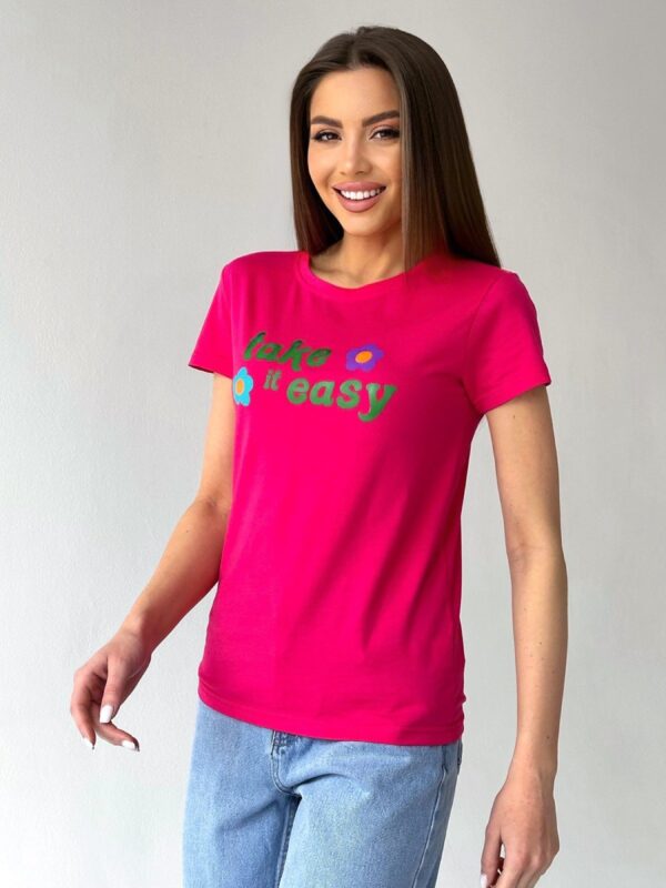 Малиновая футболка с ярким принтом. Состав: 50% хлопок, 35% вискоза, 15% полиэстер. Материал: Вискоза. Полуобхват: Грудь: S (43), M (44), Длина изделия – 60, Рукав – 13, Ткань: Высокой эластичности.