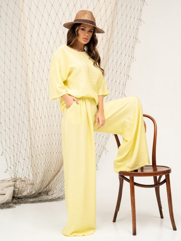 Желтый льняной костюм с широкими брюками. Состав: 65% лен, 20% хлопок, 15% полиэстер. Материал: Лен. Полуобхват: Кофта: Грудь: S (58), M (60), L (62), XL (64), Длина изделия – 69, Рукав – 23, Брюки: Талия: S (31-37), M (33-39), L (35-41), XL (37-43), Бедра: S (56), M (59), L (61), XL (63), Длина изделия – 118, Длина по внутреннему шву – 94, Ткань: Низкой эластичности.