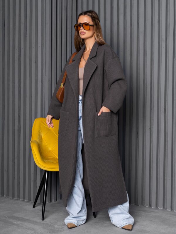 Демисезонное пальто-кардиган без застежек из плотного серого трикотажа-вязки без подклада. Модель прямого свободного кроя с макси длиной и накладными карманами. Пальто с длинными рукавами и английским воротником. Полуобхват: Грудь: S (53), M (55), L (57), XL (59), Талия: S (51), M (53), L (55), XL (57), Бедра: S (50), M (52), L (54), XL (56), Длина изделия – 118, Рукав – 53, Ткань: Низкой эластичности.