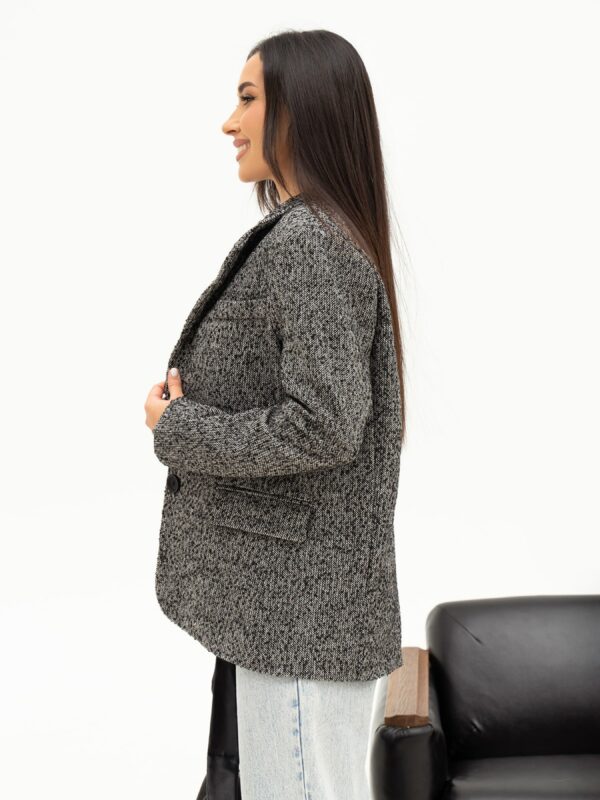 Серый фактурный пиджак из шерсти с нижним подкладом и длинными рукавами. Модель прямого кроя с воротником и застежками-пуговицами. Изделие с разрезом, карманами и декоративной листочкой. Пиджак оснащен потайными плечиками. Состав: 80% шерсть, 20% полиэстер. Материал: Твид. Полуобхват: Грудь: S (52), M (54), L (56), XL (58), Длина изделия – 70, Рукав – 59, Ткань: Низкой эластичности.