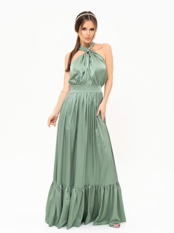 Оливковое шелковое длинное платье с открытой спиной. Оливковое нарядное макси платье из шелка с приталенным кроем и открытой спиной. Модель с широкими завязками-трансформерами, которые образуют вырез на груди. Платье оснащено молнией сзади на талии и декорировано нижним воланом.Состав: 80% шелк, 20% полиэстер. Материал: Шелк Полуобхват: Грудь: S (42), M (44), L (46), XL (48), Талия: S (33), M (35), L (37), XL (39), Бедра: S (67), M (69), L (71), XL (73), Длина изделия – 140, Ткань: Низкой эластичности.