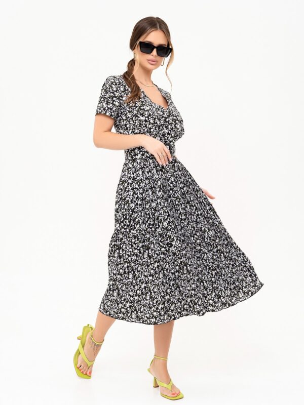 Черно-белое цветочное платье с плиссировкой. Черно-белое повседневное платье с резинкой на талии и съемным поясом. Модель с короткими рукавами и V-образной горловиной кроя на запах. Платье миди длины с плиссированным низом. Состав: 59% полиэстер, 21% эластан, 20% хлопок. Материал: Софт Полуобхват: Грудь: S (43), M (45), L (47), XL (49), Талия: S (25-32), M (27-34), L (29-36), XL (31-38), Бедра: S (57), M (59), L (61), XL (63), Длина изделия – 117, Рукав – 19, Ткань: Низкой эластичности.