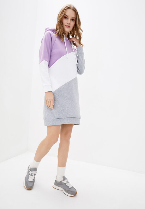 Теплое платье в спортивном стиле с капюшоном выполненное из серо-сиреневого трикотажа на флисе с белой вставкой. Платье с длинными рукавами-реглан оснащено манжетами. Модель с длиной до колен обладает прямым свободным кроем и боковыми карманами. Материал: Трикотаж на флисе