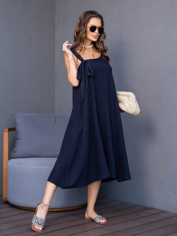 Синий сарафан с асимметричной горловиной. Свободный сарафан без рукавов с асимметричной открытой горловиной. Модель из синего текстурированного крепа с миди длиной и карманами. Модель с регулируемой бретелей-завязкой и расклешенным кроем трапеции. Состав: 59% полиэстер, 21% эластан, 20% хлопок. Матераил: Креп. Полуобхват: Грудь: S (45), M (47), L (49), XL (51), Талия: S (54), M (56), L (58), XL (60), Бедра: S (65), M (67), L (69), XL (71), Длина изделия – 112, Ткань: Низкой эластичности.
