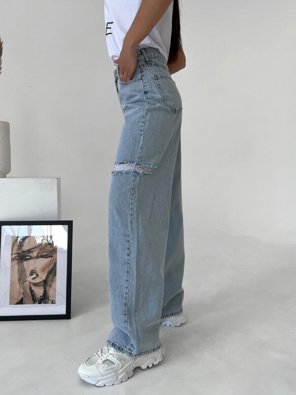 Голубые широкие джинсы с боковыми разрезами. Состав ткани: Джинс. Материал: Джинс.Полуобхват: Талия: 26 (33), 27 (34), 28 (35), 29 (36), 30 (37), 31 (38), 32 (39), Бедра: 26 (50), 27 (51), 28 (52), 29 (53), 30 (54), 31 (55), 32 (56), Длина изделия – 113, Длина по внутреннему шву – 83, Ткань – Низкой эластичности.