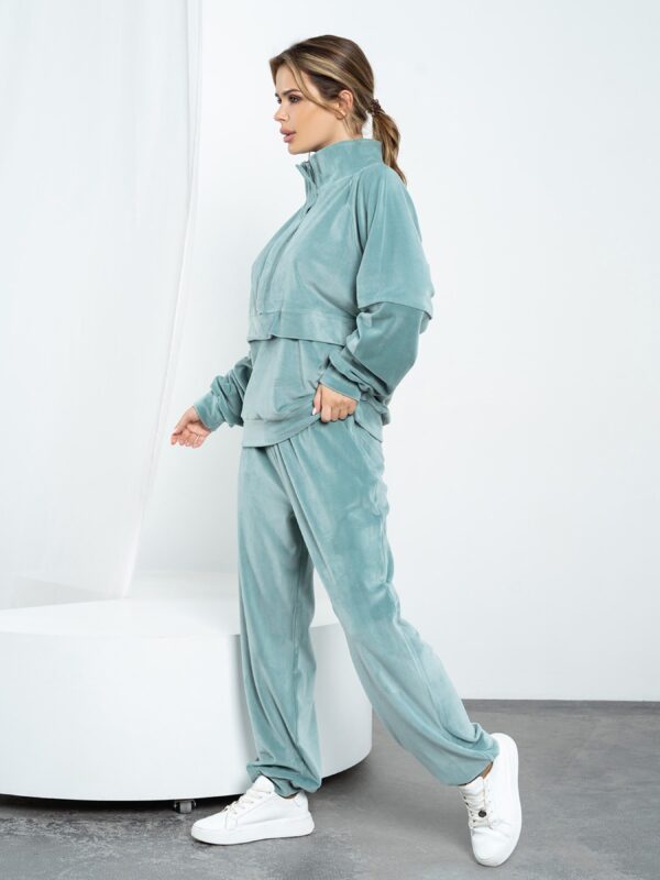 Оливковый велюровый костюм с клапаном на молнии. Состав: 65% полиэстер, 35% ликра. Материал: Велюр. Полуобхват: Кофта: Грудь: S (54), M (56), L (58), XL (60), Длина изделия – 63, Рукав – 52, Брюки: Талия: S (32-38), M (34-40), L (36-42), XL (38-44), Бедра: S (56), M (58), L (60), XL (62), Длина изделия – 103, Длина по внутреннему шву -72, Ткань: Высокой эластичности