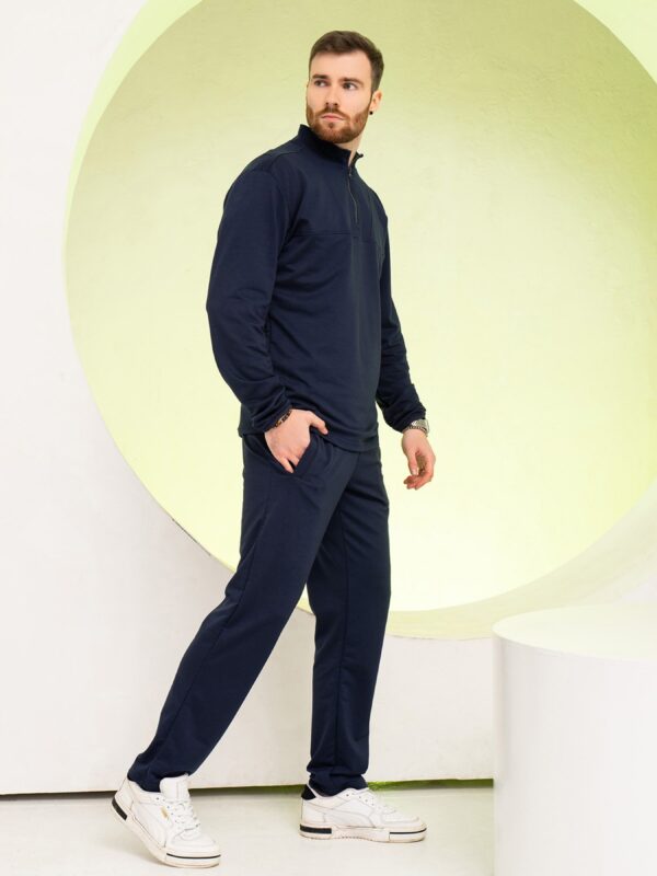 Повседневный спортивный костюм выполненный из трикотажной двухнитки темно-синего цвета. Толстовка с укороченной молнией и воротником-стойкой. Модель прямого свободного кроя с длинными рукавами на резинках. Брюки с карманами и поясной резинкой обладают прямым кроем. Состав: 50% хлопок, 50% полиэстер. Материал: Двухнить Полуобхват: Кофта: Грудь: S (53), M (55), L (57), XL (59), Длина изделия – 70, Рукав – 67, Брюки: Талия: S (36-44), M (38-46), L (40-48), XL (42-50), Бедра: S (52), M (54), L (56), XL (58), Длина изделия – 104, Длина по внутреннему шву – 80, Ткань: Средней эластичности.