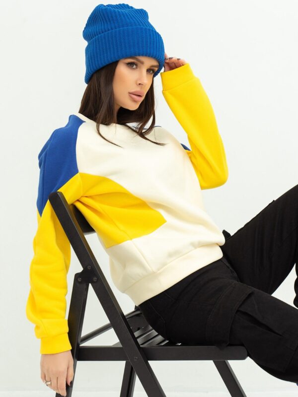 Молочний комбінований світшот виконаний з трикотажу на флісі зі вставками синього та жовтого кольорів. Модель прямого крою з манжетами та довгими рукавами. Горловина О-подібної форми. Склад тканини: 80% шерсть, 20% поліестер. Матеріал: Вовна Напівобхват: Груди: S (65), M (67), L (69), XL (71), Довжина виробу – 72, Рукав – 57, Тканина: Висока еластичність.