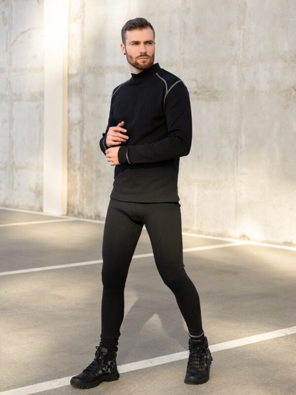 Черный комплект термобелья с декоративными швами. Состав ткани: 80% хлопок, 20% эластан. Материал: Коттон на флисе. Полуобхват: Кофта: Грудь: S (50), M (52), L (54), XL (56), Длина изделия – 70, Рукав – 69, Брюки: Талия: S (32-40), M (34-42), L (36-44), XL (38-46), Бедра: S (43), M (45), L (47), XL (49), Длина изделия – 104, Длина по внутреннему шву – 77,Ткань: Высокой эластичности