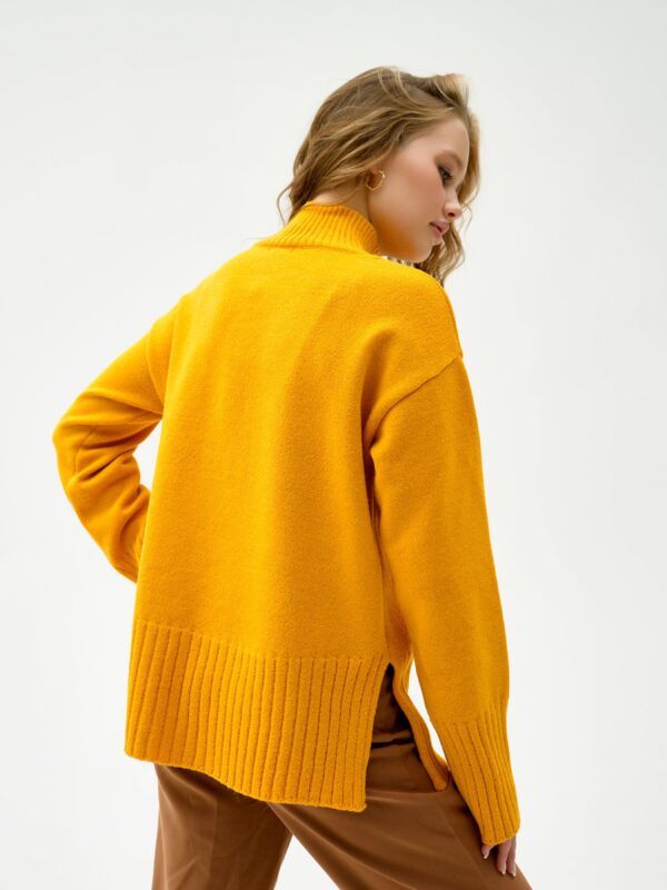 Состав: 60% акрил, 30% шерсть, 10% эластан. Свитер выполнен из пряжи с содержанием шерсти. Высокая горловина. Спущенные плечи, длинные рукава с широкими манжетами. По бокам свитера небольшие декоратиные разрезы. Свободная посадка. Ворот, манжеты и низ изделия выполнены резинкой.